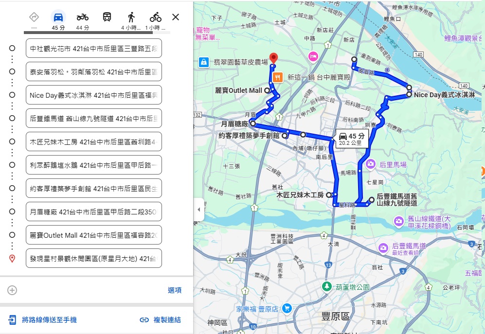 按照后里地圖來看,后里四號公園附近可以順遊的有月眉糖廠中社花市后豐鐵馬道約客&厚禮木匠兄妹木工房利眾醉鵝塩水鵝